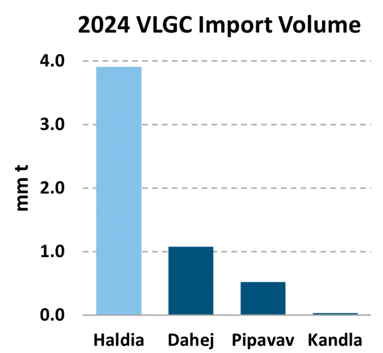 - Indian LPG imports reached 20.6 mm t in 2024 according to PPAC, 72 % of this analyzed by ship tracking to have been on VLGCs (around 15 mm t)