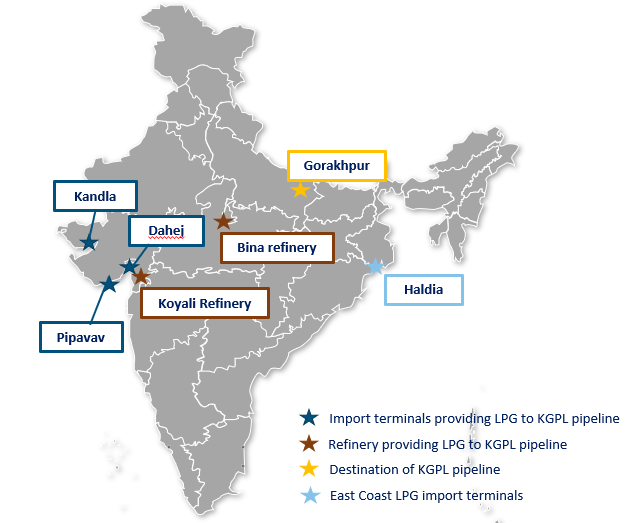 - According to IHB, the consortium responsible for the pipeline, LPG will be sourced from the import terminals Kandla, Dahej and Pipavav, along with two refineries at Koyali and Bina. The three companies leading the project are IndianOil (50%), HPCL (25%) and BPCL (50%), and have been developing the project since 2019.