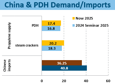 • One area where NGLStrategy’s view remained closely aligned with actual outcomes was propylene supply from PDH plants. We initially projected output at 16.8 mm t; updated estimates now place this closer to 17.4 mm t – only a 3% differential. Overall propylene demand in China exceeded expectations, supported by incremental production not only from PDH units but also from steam crackers, which contributed an additional ~2 mm t above the original forecast.