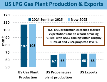 • Our initial expectation for US gas plant production in 2025 was just over 107 mm t. However, consistently strong NGL production economics and rising gas-to-oil ratios—particularly in the Permian—pushed actual LPG output above 108 mm t. Overall, NGLStrategy’s estimate was within 1% of the realized figure.