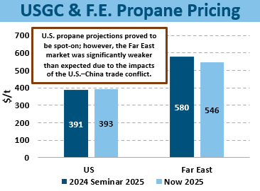 • Propane price expectations for US Mt Belvieu were closely aligned with actuals, with only a 1% deviation. However, weaker Far East demand resulted in realized prices averaging roughly 6% below NGLStrategy’s late-2024 forecast.