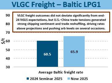 • For freight, the 2025 Baltic rate was initially expected to average around $60.5/t. Increased cargo reshuffling and higher ton-miles—driven by a shift toward more US-to-South Asia and US-to-Southeast Asia flows due to tariffs—pushed rates higher. As a result, the average Baltic freight rate for 2025 is now expected to approach $66/t.